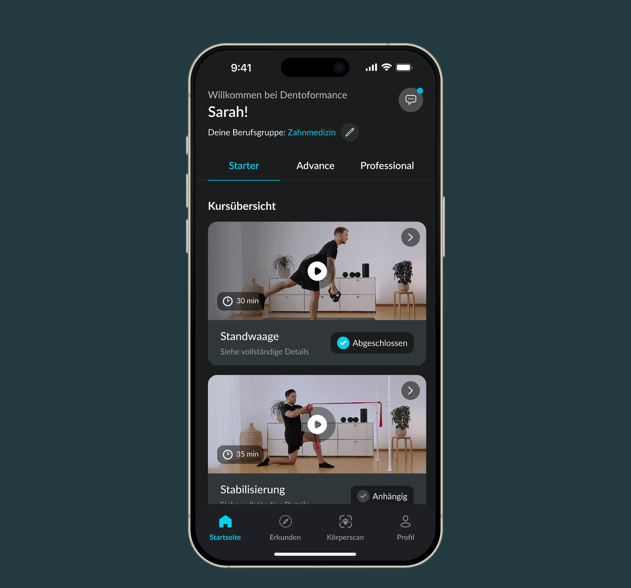 Das Programm besteht aus verschiedenen Modulen, die sich auf unterschiedliche Aspekte des körperlichen Wohlbefindens konzentrieren, einschließlich Körperanalyse, Faszienpflege, Dehnen, Stabilisierung und Kräftigung. Diese werden über unsere App in Form von HD-Videotutorials und personalisierten Trainingsplänen bereitgestellt.